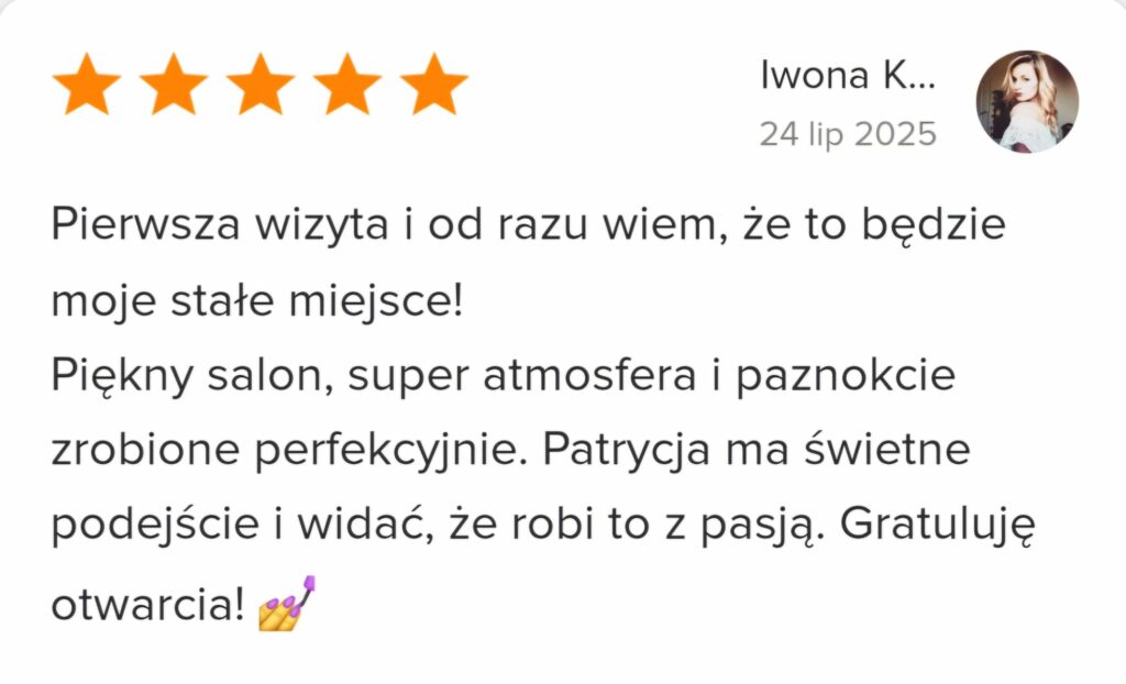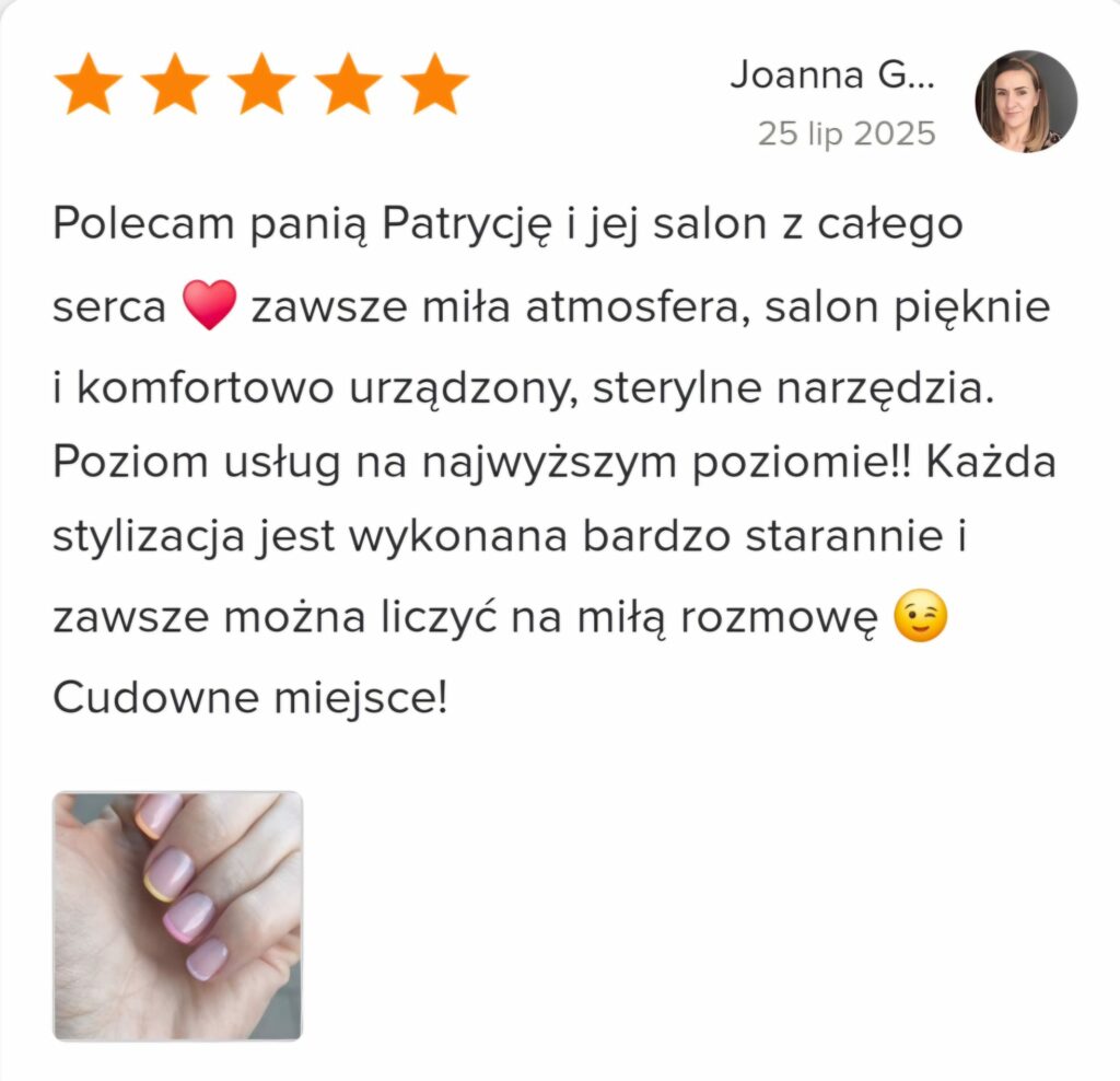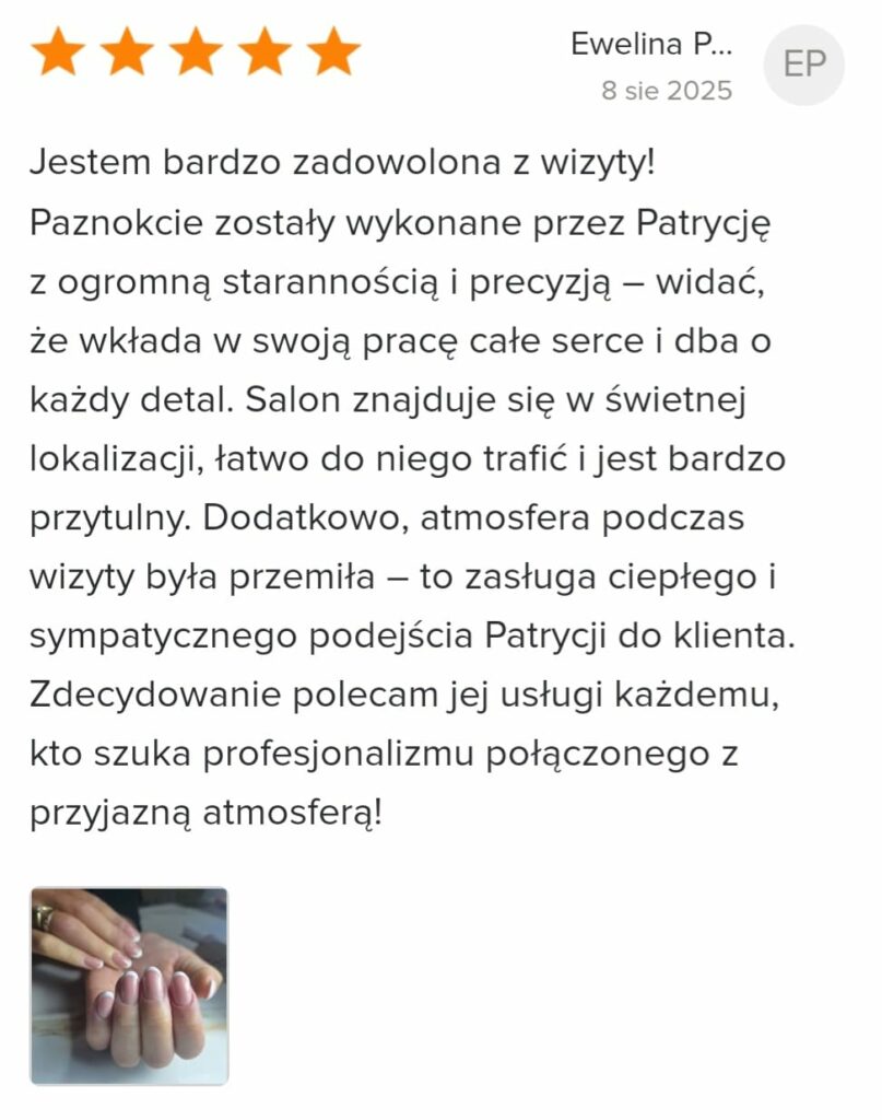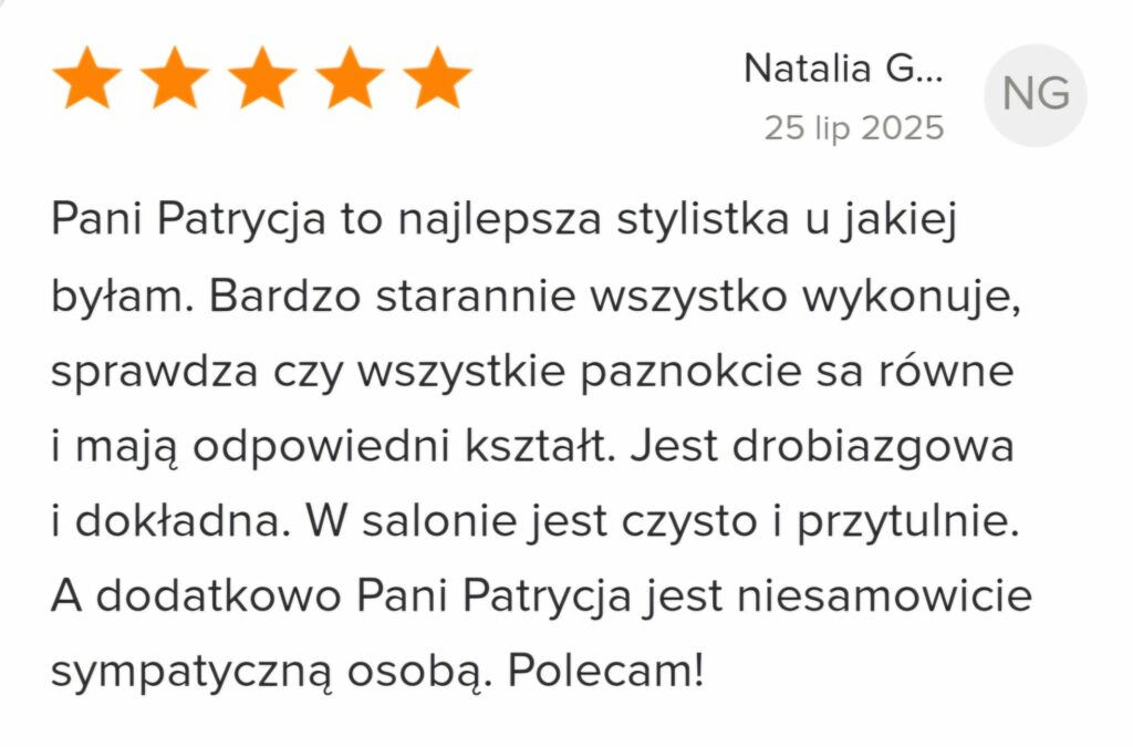 Mam na imię Patrycja i zapraszam Cię do ManiShine – miejsca, które stworzyłam dla kobiet, które chcą mieć paznokcie zrobione dokładnie, estetycznie i w spokojnych warunkach.