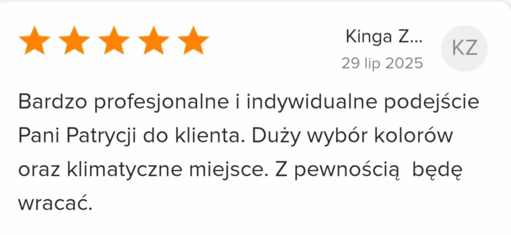 Zależy mi, żebyś czuła się komfortowo od początku do końca: bez chaosu, pośpiechu czy niepewności. Pracuję na sprawdzonych produktach, dbam o każdy szczegół i słucham, czego naprawdę potrzebujesz – żebyś mogła wyjść z salonu z poczuciem: „wszystko jest tak, jak chciałam”.